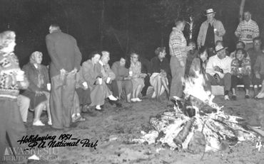 “ Houghton’s greatest assets were his boundless enthusiasm and seemingly limitless drive. He had an uncanny ability to motivate people to get involved; in fact, the park’s recreation program would not have been as successful if it had not been for the many individuals and families who freely lent their support and assistance. At the same time, Harry led by example. He himself lived in a shack tent with his wife and children and was thereby considered by the campers to be one of their own. He was also constantly on the move - when not supervising or taking part in activities, he could be found walking around the townsite with a megaphone announcing the day’s activities and times. On rainy days, he would often drive through the campground with a large truck and, like the pied piper, coax children to come along down to the community hall.”