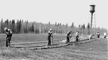 In 1933, there were more than 1,000 men living in these camps. Among the projects they accomplished are clearing the Park boundary and road allowances, leveling the campground, storing ice for summer use, building the breakwater and beach houses, constructing the tennis courts and golf course, and building the community buildings in the townsite.
