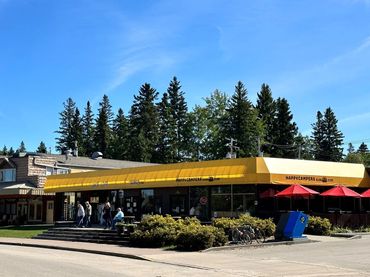 Other businesses located here over the years were the Patio Cafe, Traeger’s Bakery, clothing stores, and gift shops selling souvenirs and aboriginal arts and crafts. Now the yellow awnings and patio umbrellas lend a cheerful air to downtown Waskesiu.