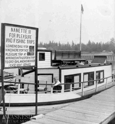 When the townsite of Waskesiu was established in the newly created National Park, Peases moved to the present location, building a one-storey house and boat shed using similar plans as the Arcade Stores on Lakeview Drive. They expanded their boat rental with two larger tour boats, the Nanette I and II and ran a commercial fishing operation too. They partnered with Sam Brayford who handled the boat rentals while Alex worked the commercial nets in Waskesiu Lake and staff processed the catch at the Fish Shop. The building is currently used as a private residence and a Guest House in the summer.