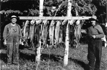 “A familiar sound in the townsite at 5:00 A.M. was the whine of Alex’s motor as he headed out to his nets. He used an 8.1 Johnson workhorse motor on one of his father’s original boats and the motor could be easily heard on the clear morning air. The nets were set in sixty feet of water and re-set after they were emptied. Periodically the nets would be brought in, wound on the big reels beside the white house on the hill, then untangled and mended. Alex’s most faithful helpers for many years were two other well-known Waskesiu “characters”, Grandpa Van Impe and Bob Berry….